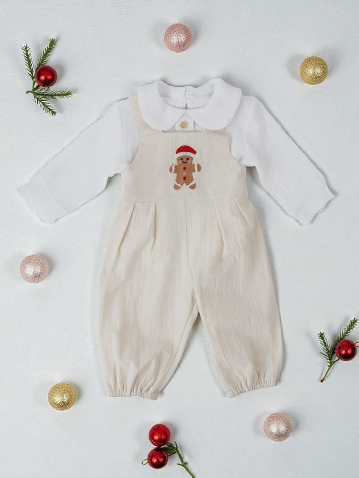 Set elegant pentru baieti, compus din salopeta din in si bluza fina din muselina de bumbac. Broderia cu omuletul de turta dulce adauga un detaliu unic si delicat, perfect pentru un sarbatori si evenimente speciale