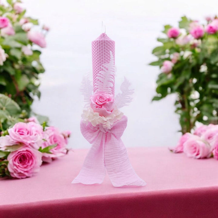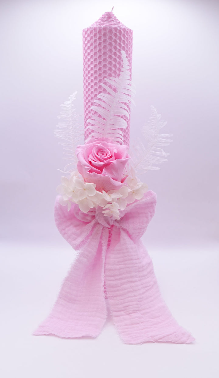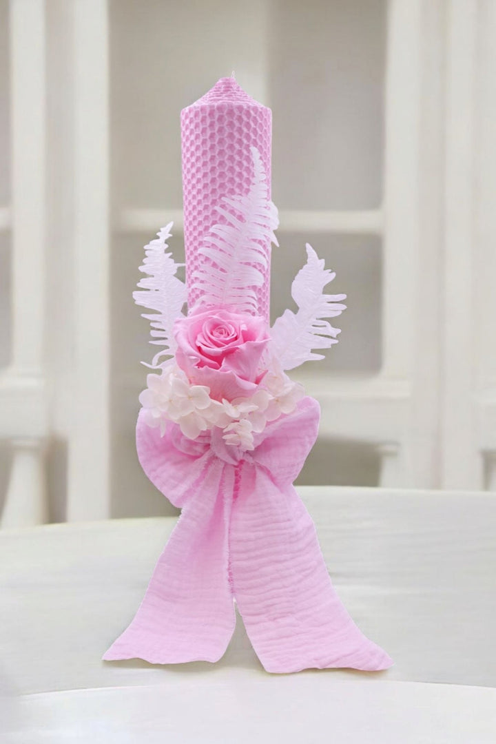 Lumanare de botez realizată din ceară naturală de albine, cu o textură elegantă de fagure și un parfum fin, autentic de miere. Decorată manual cu flori de hortensie, un trandafir criogenat și frunze naturale de ferigă uscată. Un design care îmbină naturalețea cu rafinamentul, creat cu atenție la fiecare detaliu.