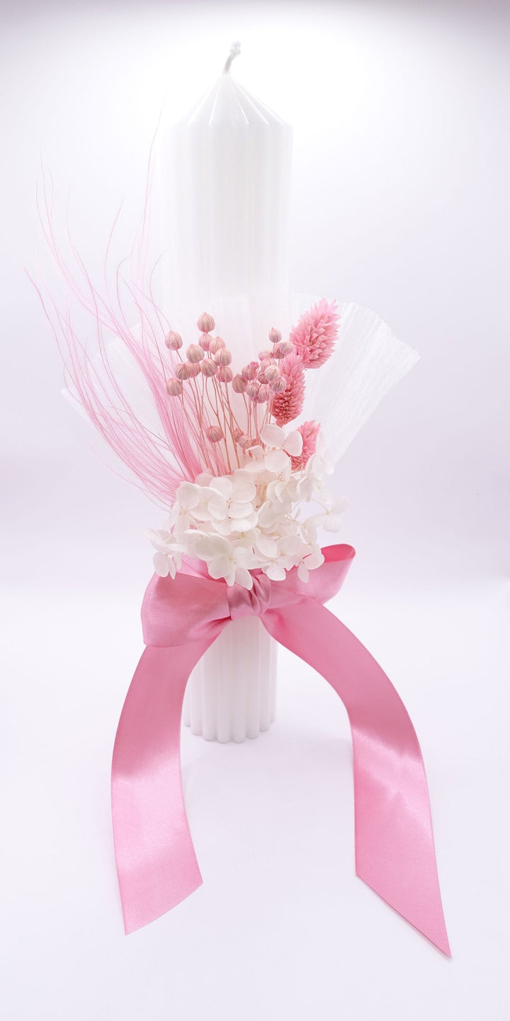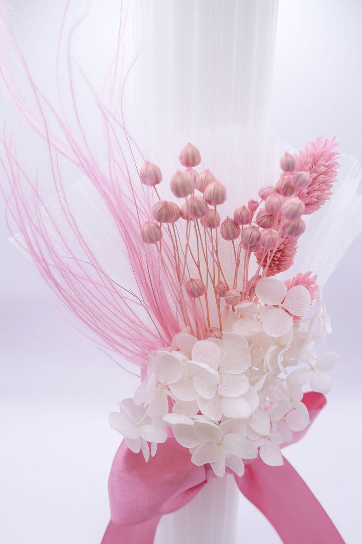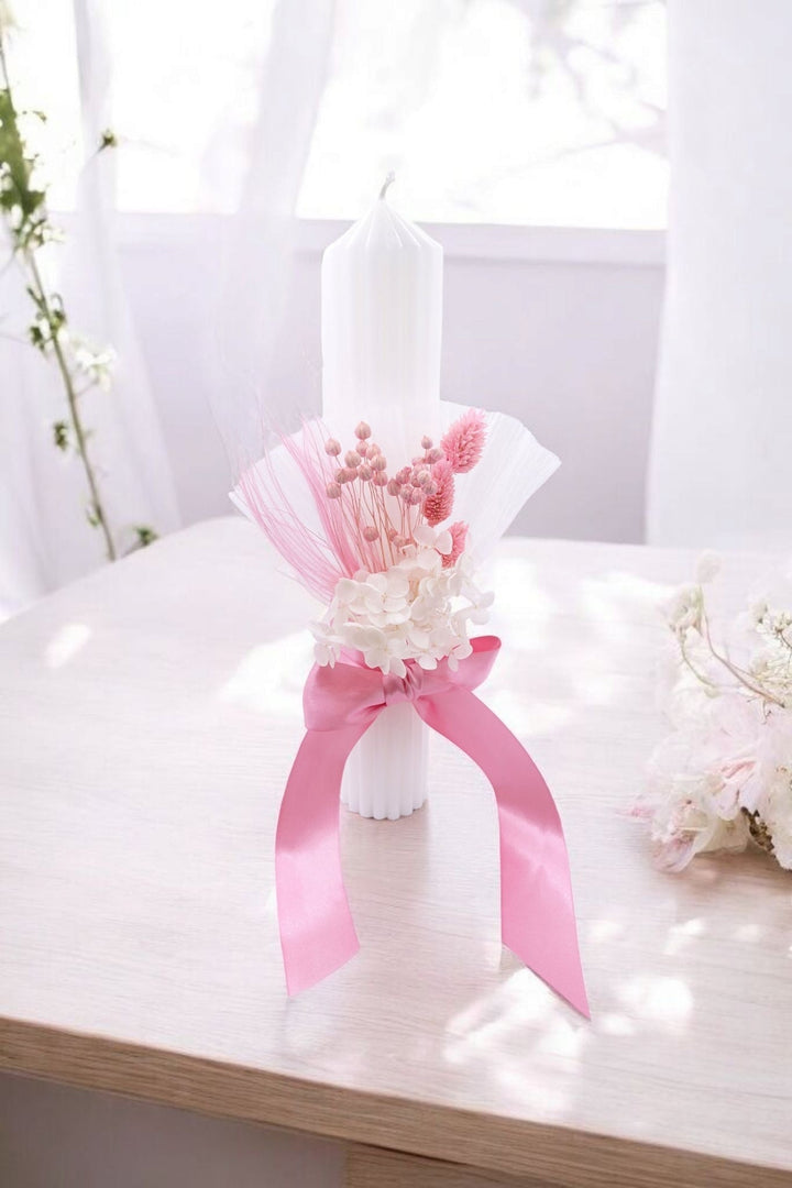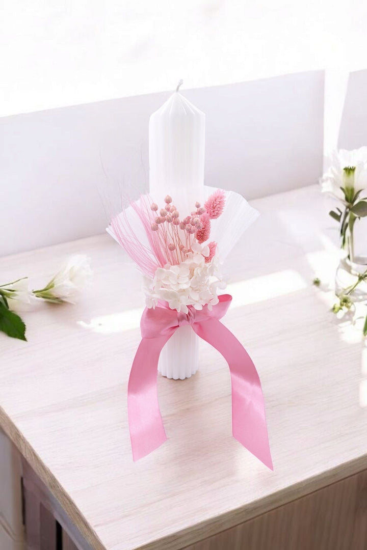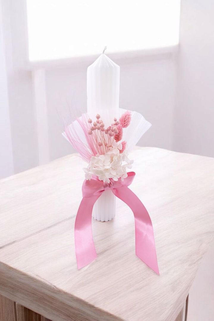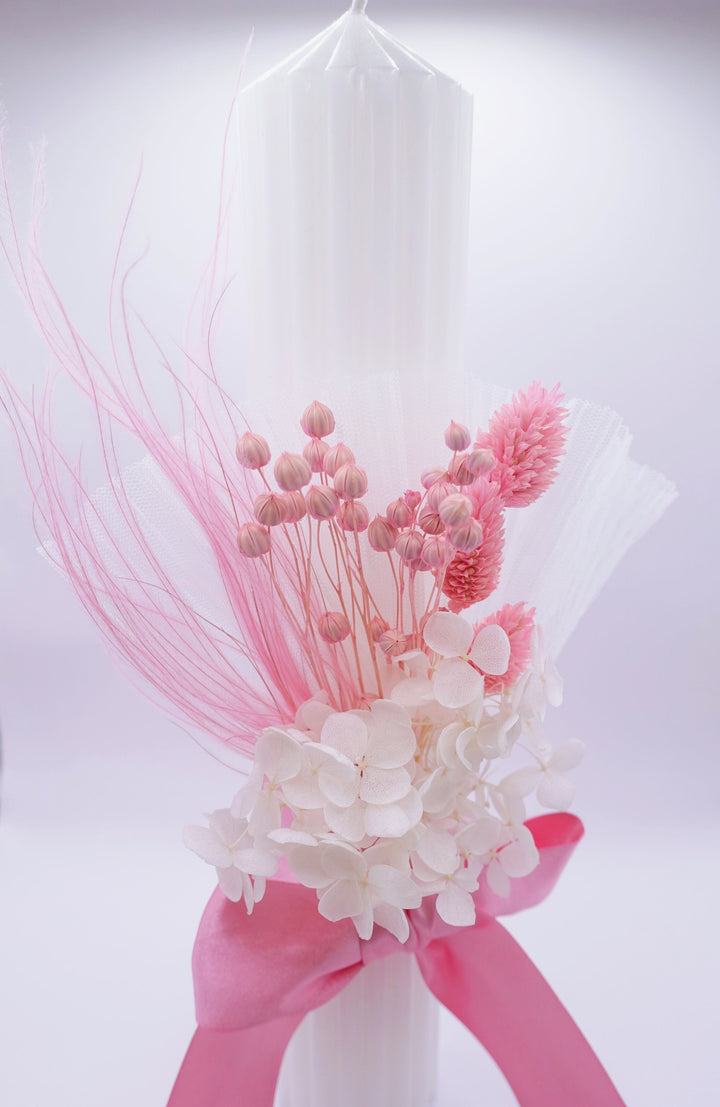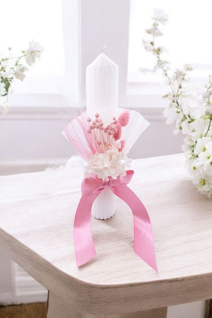 Lumanare pentru botez, decorata manual cu flori uscate naturale, hortensie criogenata si voal.